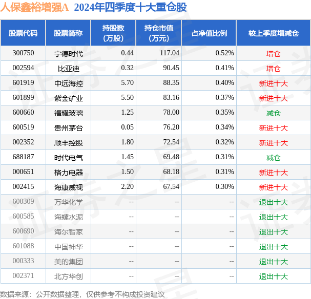 人保鑫裕增强A为债券型-混合二级基金,根据最新一期基金季报显示,该基金资产配置:股票占净值比18.05%,债券占净值比83.4%,现金占净值比0.88%。基金十大重仓股如下: